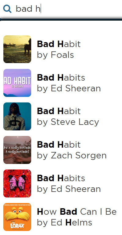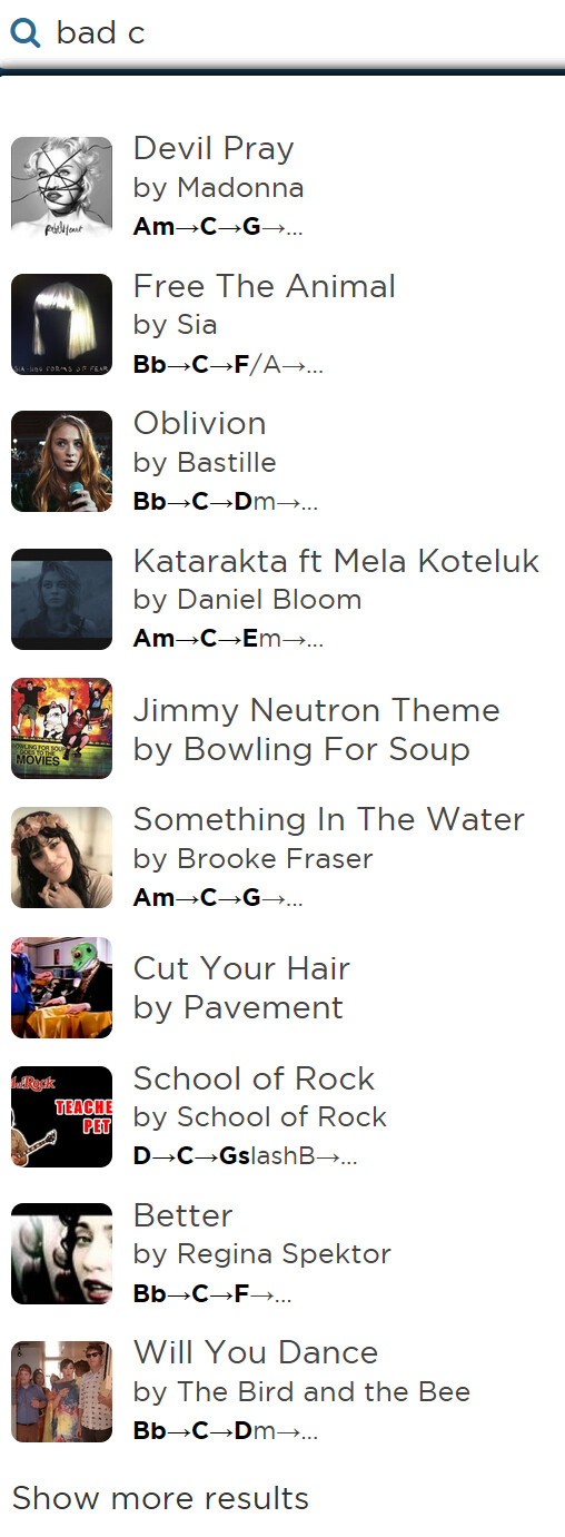 When searching with a word using only the letters A through G, then a space, then another letter from A to G, it only returns matching chord sequences. For example, this makes it impossible to find Bad Case of Loving You by entering the song name normally. After typing “bad c” we only see chords: